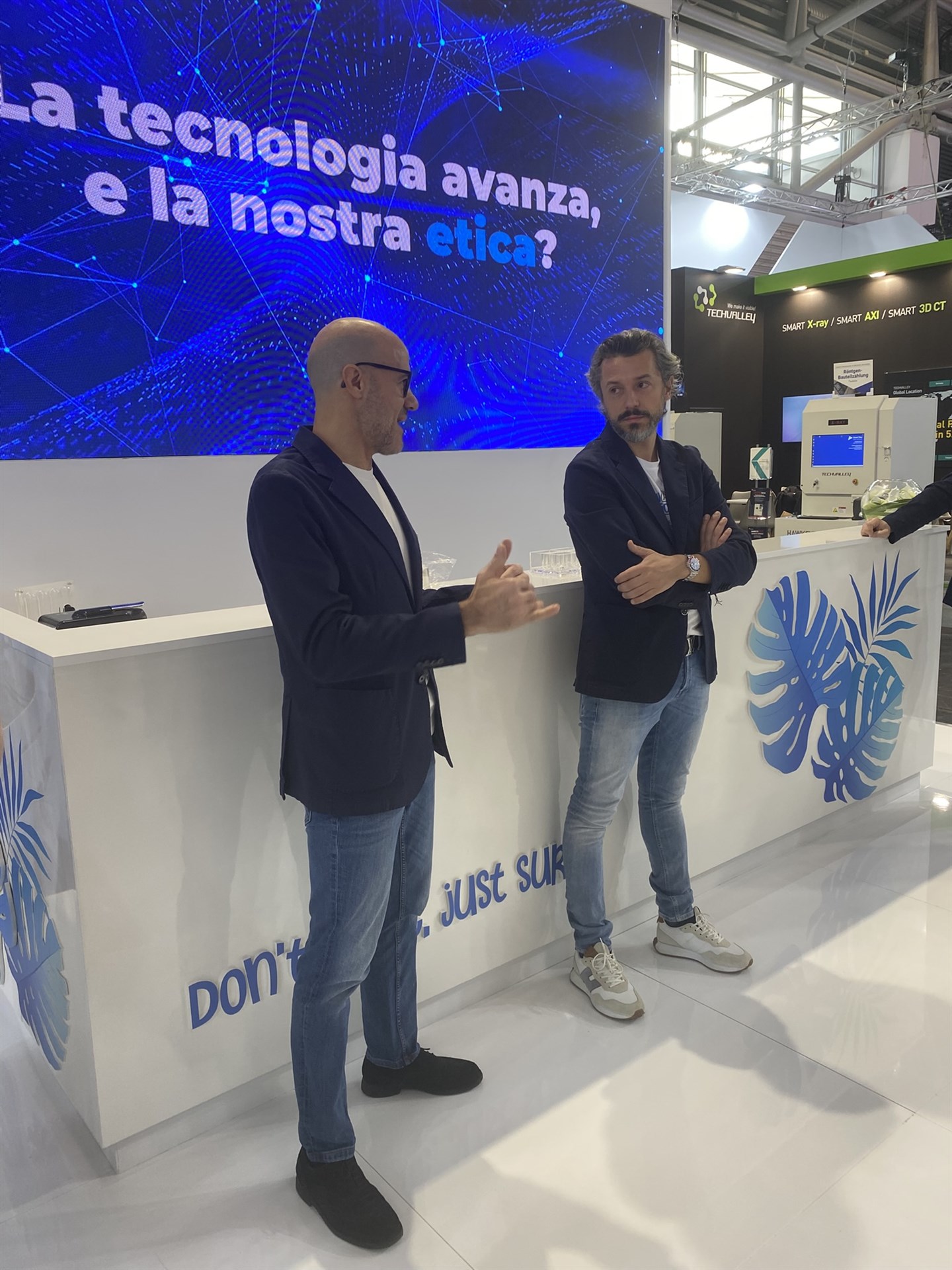 A rappresentare visivamente questo concetto, un videowall a tutta altezza proiettava in loop una sequenza di domande stimolanti, invitando i presenti ad una riflessione sulle implicazioni dell’utilizzo dell’AI in ambiti fino a ieri considerati estranei a questa tecnologia, come il mondo medico, legale, sanitario, giuridico e politico.