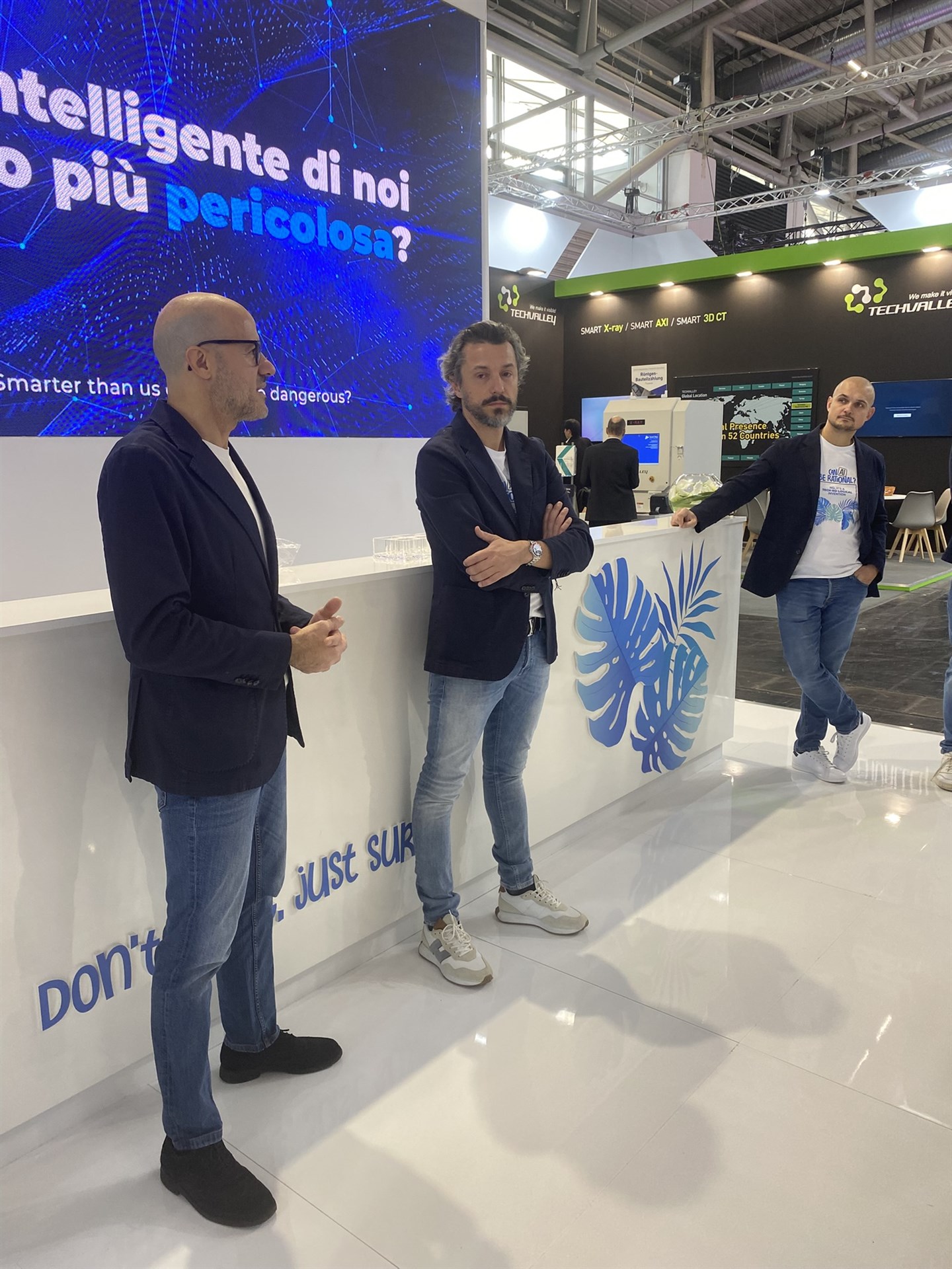 A rappresentare visivamente questo concetto, un videowall a tutta altezza proiettava in loop una sequenza di domande stimolanti, invitando i presenti ad una riflessione sulle implicazioni dell’utilizzo dell’AI in ambiti fino a ieri considerati estranei a questa tecnologia, come il mondo medico, legale, sanitario, giuridico e politico.